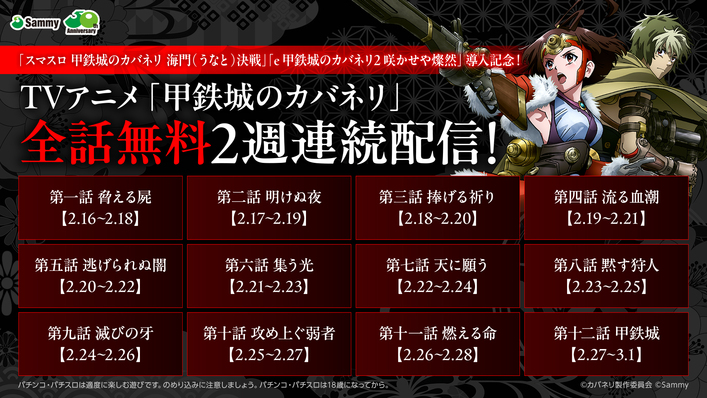 サミーチャンネルにて「e 甲鉄城のカバネリ2 咲かせや燦然」「スマスロ 甲鉄城のカバネリ 海門(うなと)決戦」導入を記念して、アニメ「甲鉄城のカバネリ」全話無料配信を実施致します。期間限定(2/16~3/1)の配信になりますのでこの機会にぜひ、チェックしてみてください。